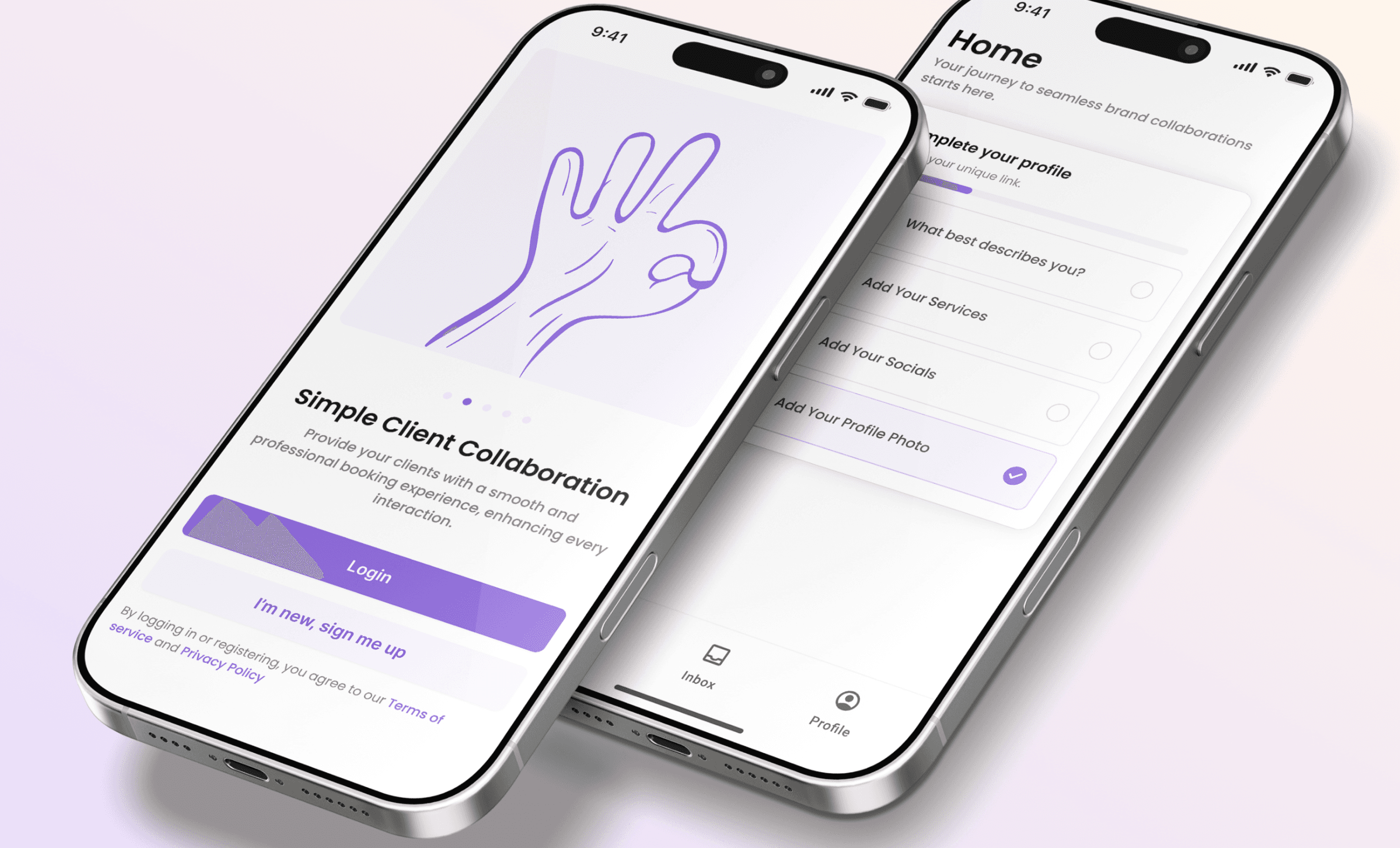 I designed a streamlined onboarding and service setup flow, built a clean inbox system for collaboration requests, and created profile structures that showcase social links and services clearly.